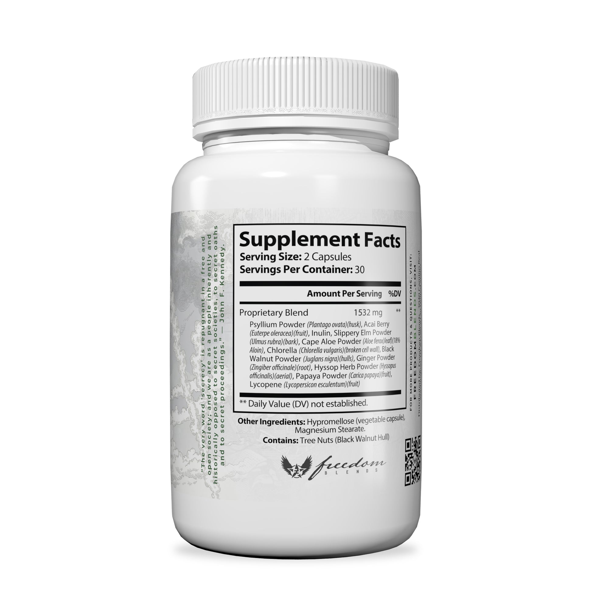 Psyllium Powder (Plantago ovata) (husk), Acai Berry (Euterpe oleracea) (fruit), Inulin, Slippery Elm Powder (Ulmus rubra) (bark), Cape Aloe Powder (Aloe ferox) (leaf) (18% Aloin), Chlorella (Chlorella vulgaris) (broken cell wall), Black Walnut Powder (Juglans nigra) (hulls), Ginger Powder (Zingiber officinale) (root), Hyssop Herb Powder (Hyssopus officinalis) (aerial), Papaya Powder (Carica papaya) (fruit), Lycopene (Lycopersicon esculentum) (fruit)
